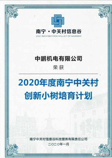 中鹏入选《2020年度南宁中关村“创新小树”培育计划》